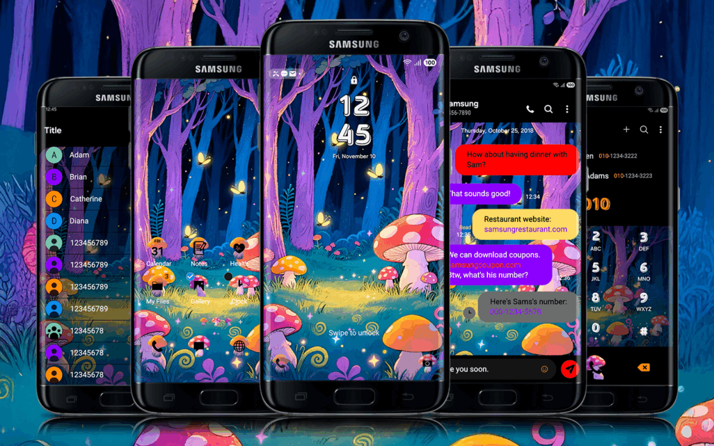 A whimsical fairy-tale theme set in an enchanted forest, where soft moonlight filters through tall trees and illuminates clusters of colorful mushrooms nestled in grass. Tiny glowing fireflies drift through the air, casting a gentle, magical glow that dances across the scene. The atmosphere feels dreamy and serene — a perfect blend of nature and fantasy, evoking the wonder of a hidden woodland world.